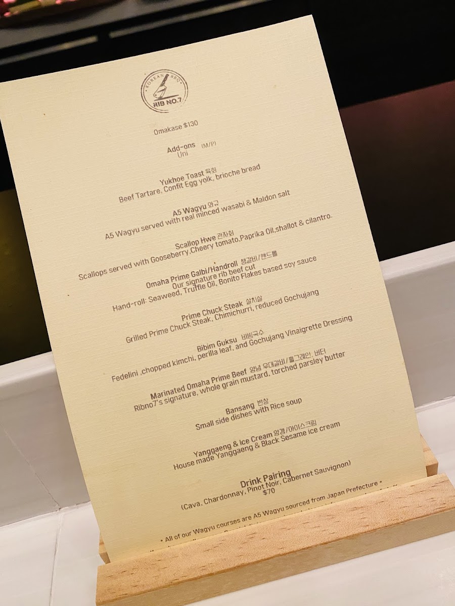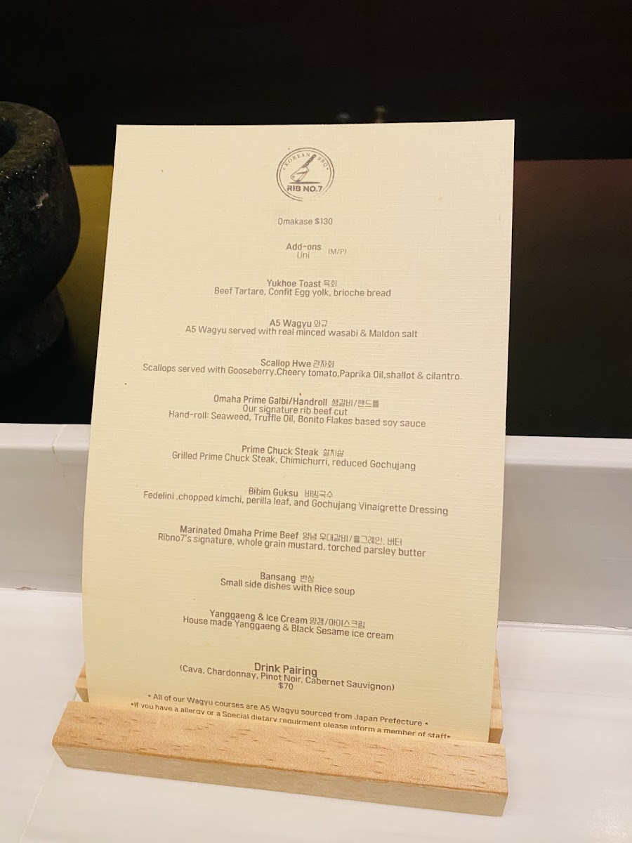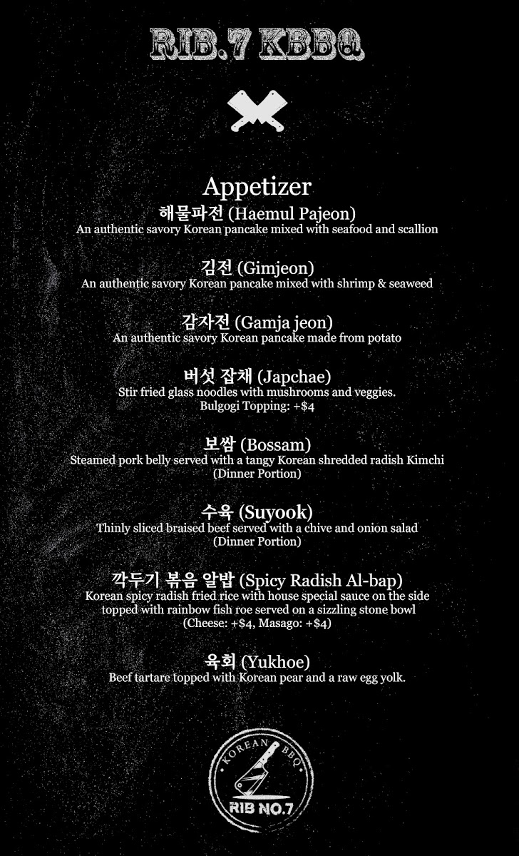 Rib No. 7 offers a thoughtfully curated menu that blends the rich traditions of Korean barbecue with a fine dining approach. The dishes range from comforting stews like Seafood Soondubu and Doenjang Jjigae to beautifully marinated grilled cuts such as LA Galbi. For those seeking a complete tasting experience, the Omakase option provides a carefully prepared progression of flavors that complements the attentive and calm atmosphere of the restaurant.